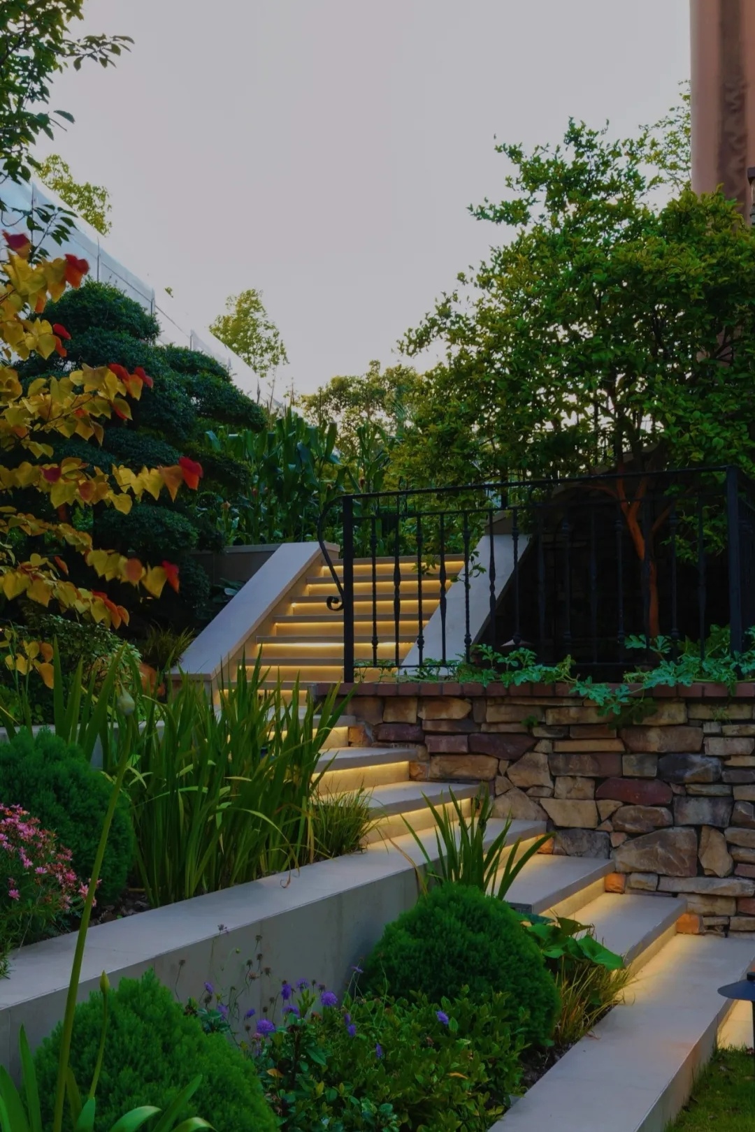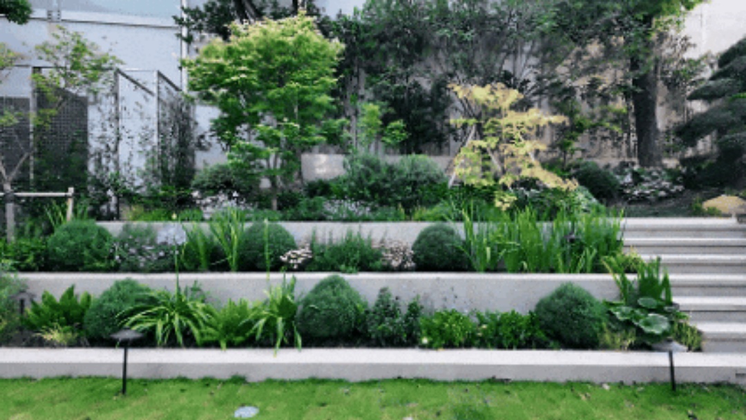 在植物配置上,依托阶梯式地形,通过精心搭配使各类植物前后错动、高低呼应,形成清晰而灵动的景观层次,极大增强了空间的纵深感与观赏性。