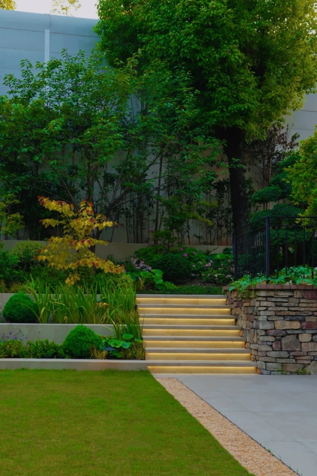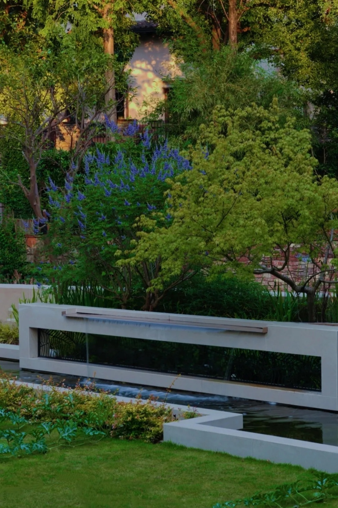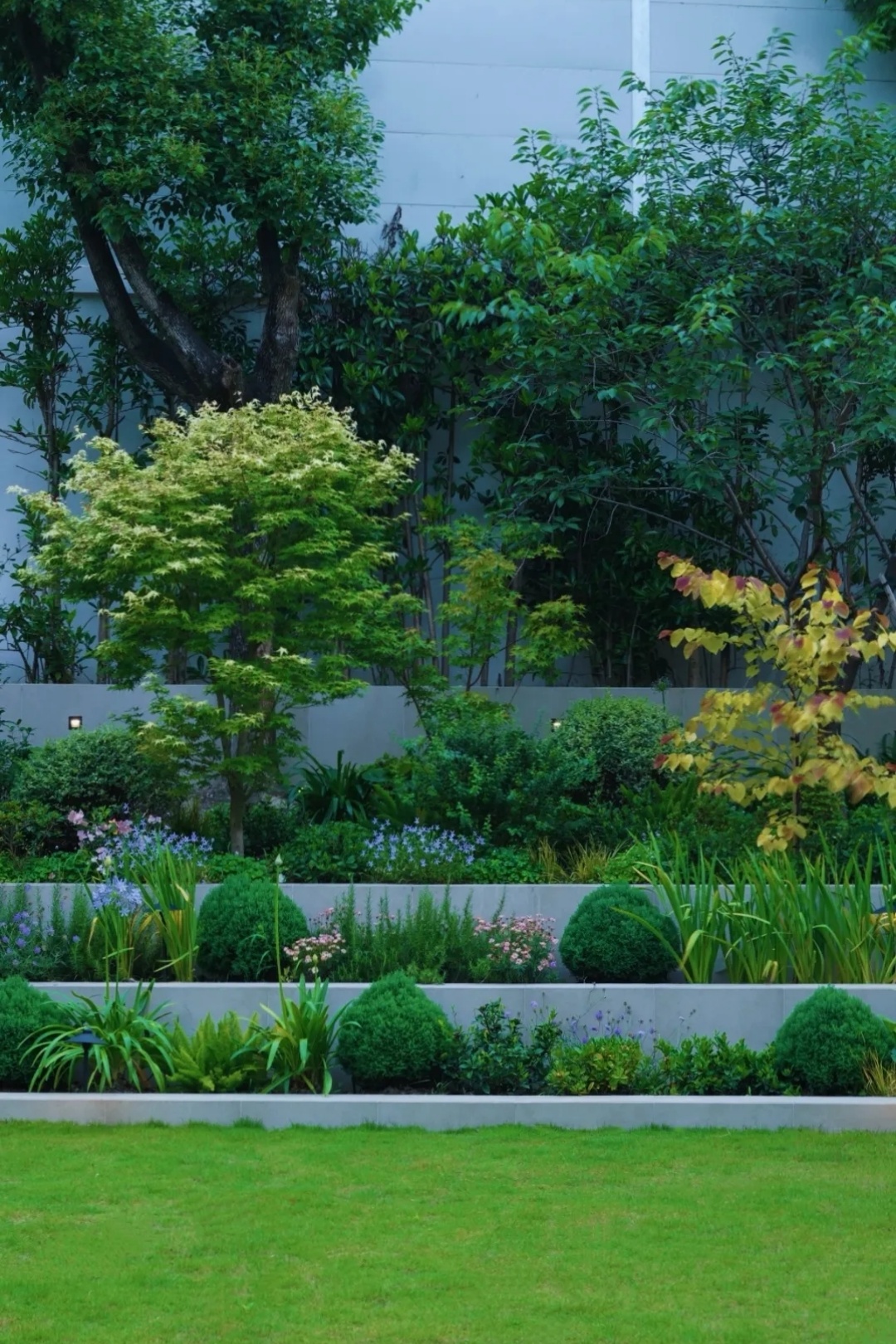 同时,基于后方围墙较高的现状,我们希望通过植物层次的进退与虚实变化,进一步柔化墙体的生硬与单调感,使其转化为富有自然意趣的绿色背景。