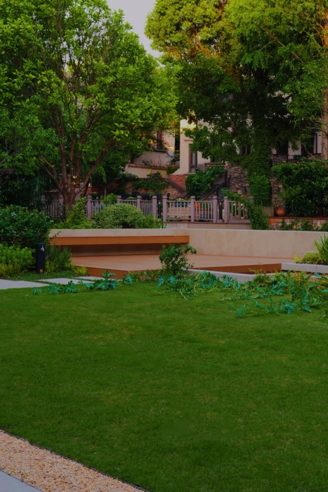 整个花园高差比较大,我们当时改造花园这个区域的时候,它是整体是一个斜坡面,不管是景观还是通行都不方便,所以我们最后考虑把它改造成一个阶梯式的景观,以化解高差并提升功能与美感。