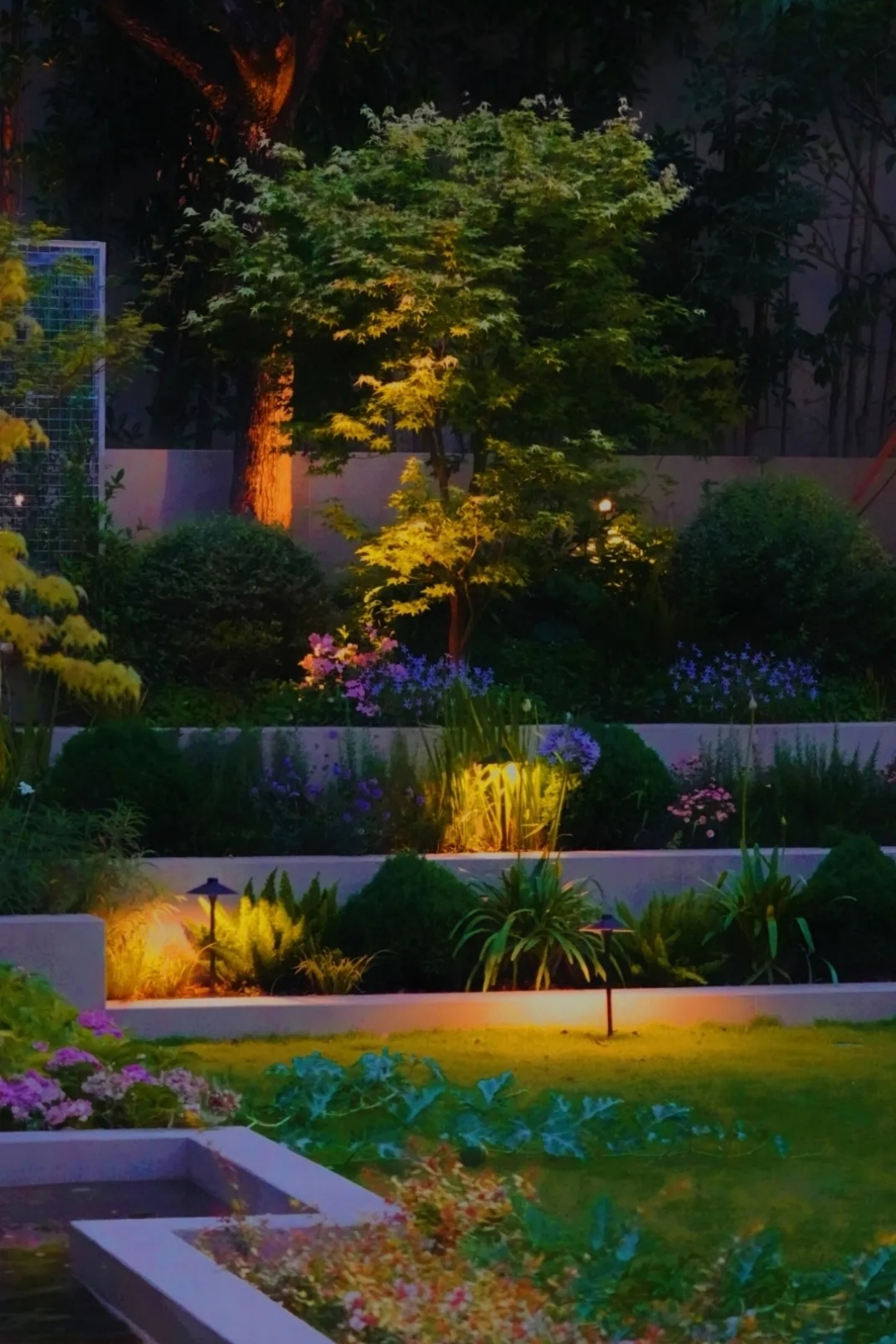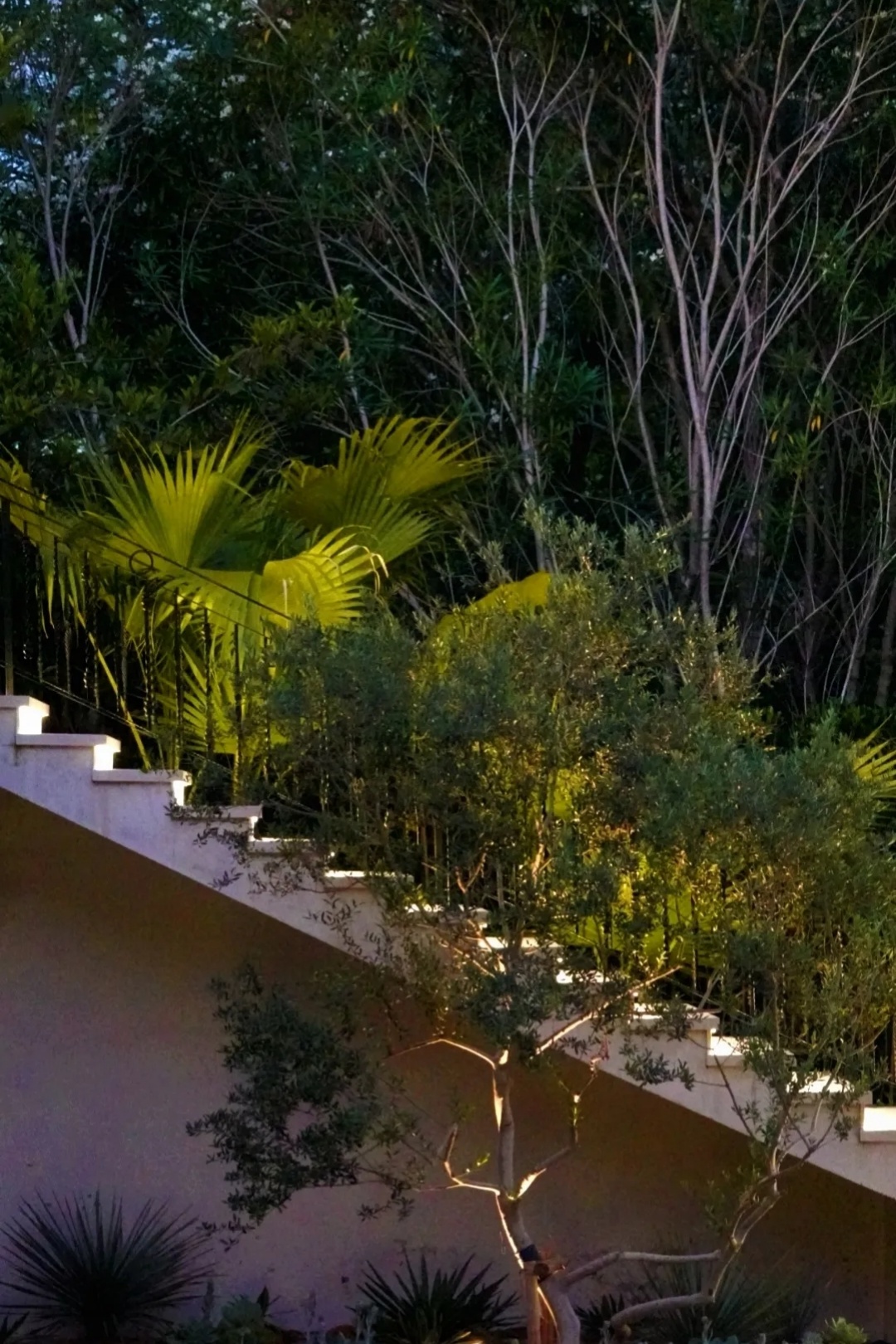 灯光不仅强化了植物间错动的高低关系,更以温暖的光色和精准的角度,使叶片、枝干与花朵在暗夜中呈现出细腻的质感与色彩变化。步移景异,光影随之流转,原本静止的植物景观在夜晚焕发出新的生命力。