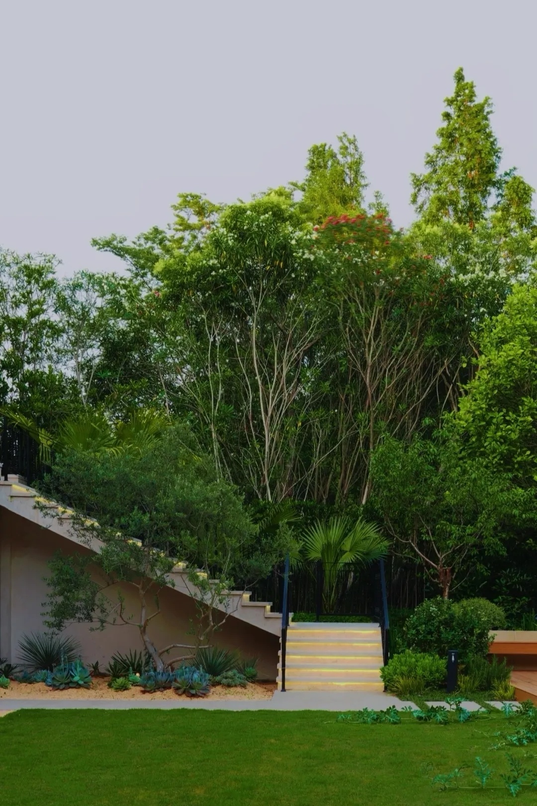建筑与景观形成的夹角区域,通过错层式台阶与高低组合的植物配置,使原建与自然景观更好地融合。这一设计旨在弱化硬质结构的生硬感,提升视觉观赏性与空间的协调性。