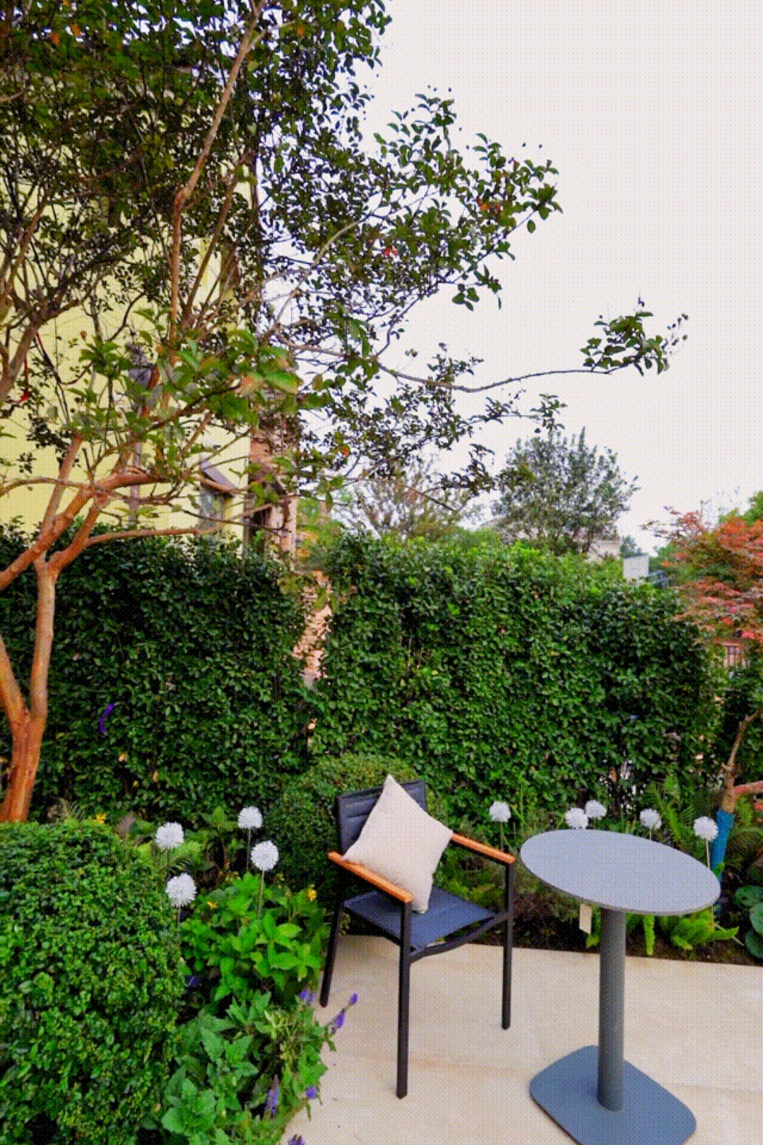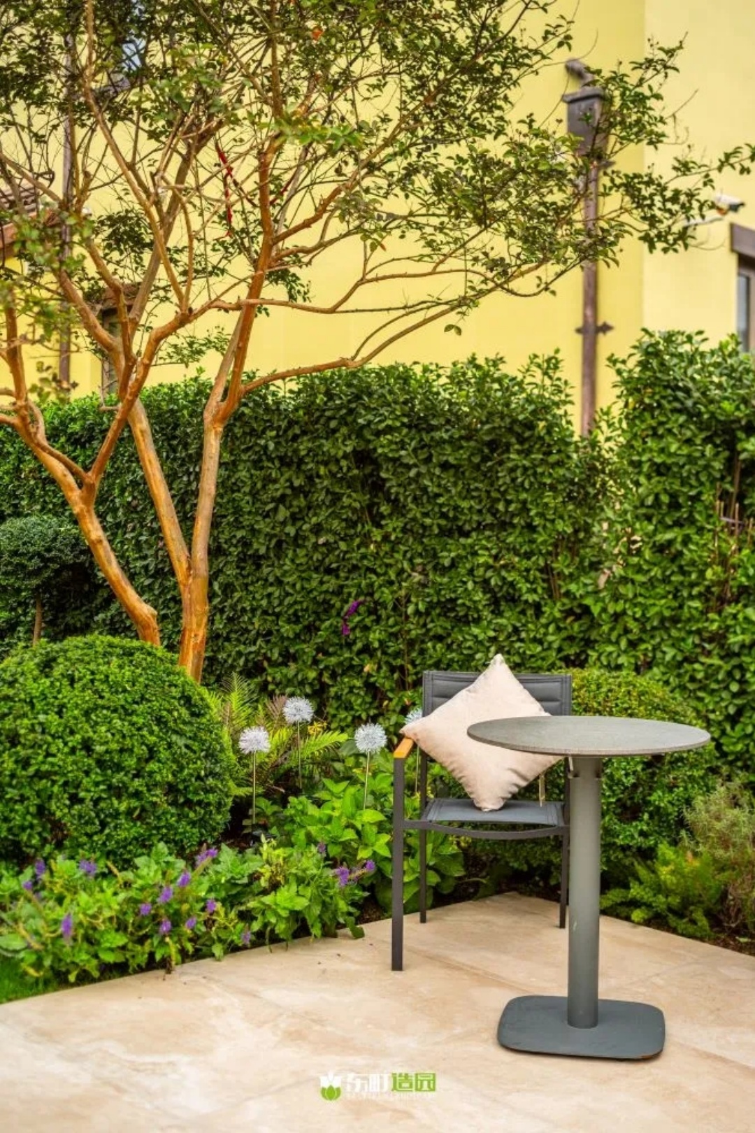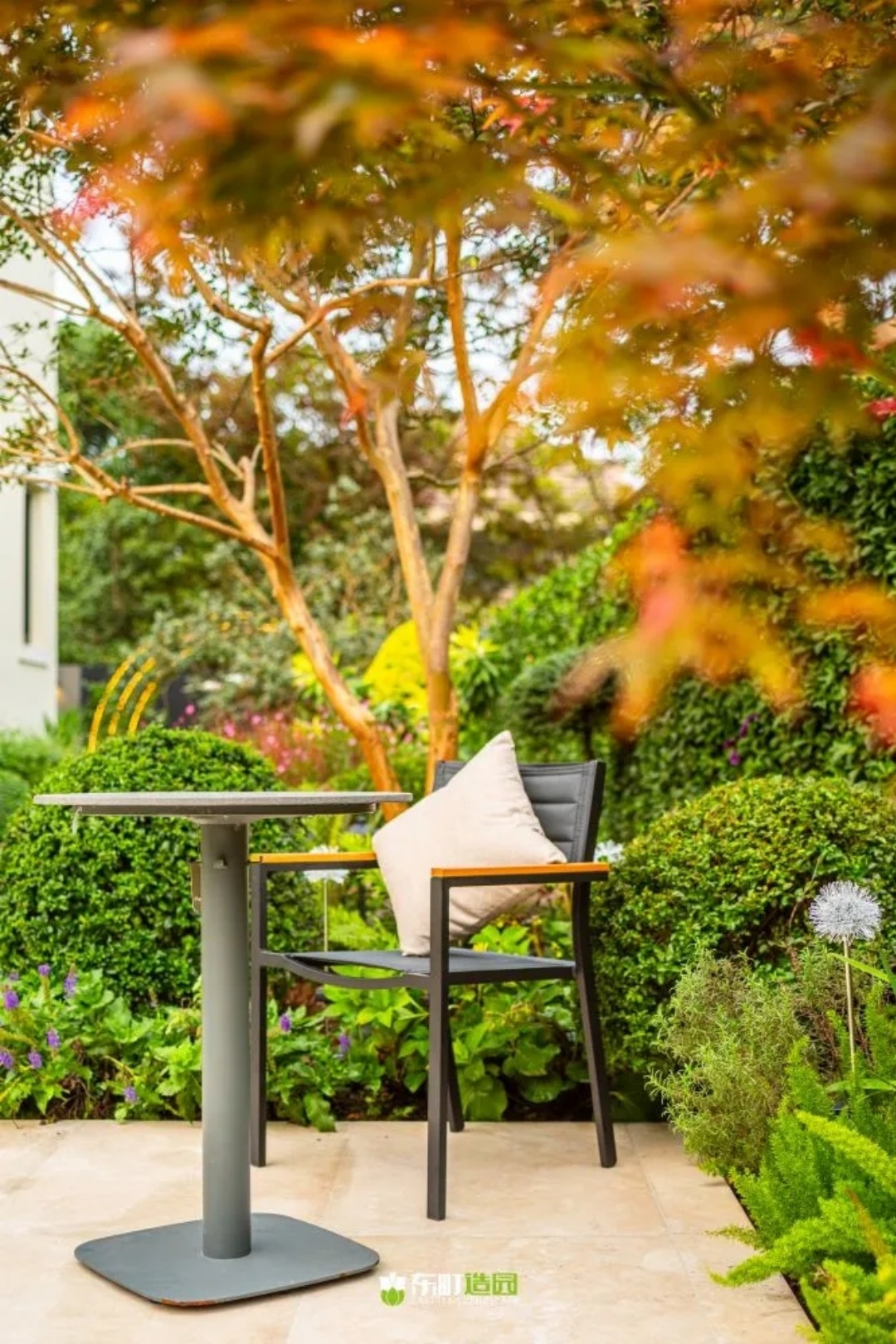 我们不仅在设计整个空间布局时考虑了植物的部分,还在搭配中注重细节和氛围感。比如说,下午太阳照在旁边一棵树荫下,我坐在这边感觉真的是绝了。