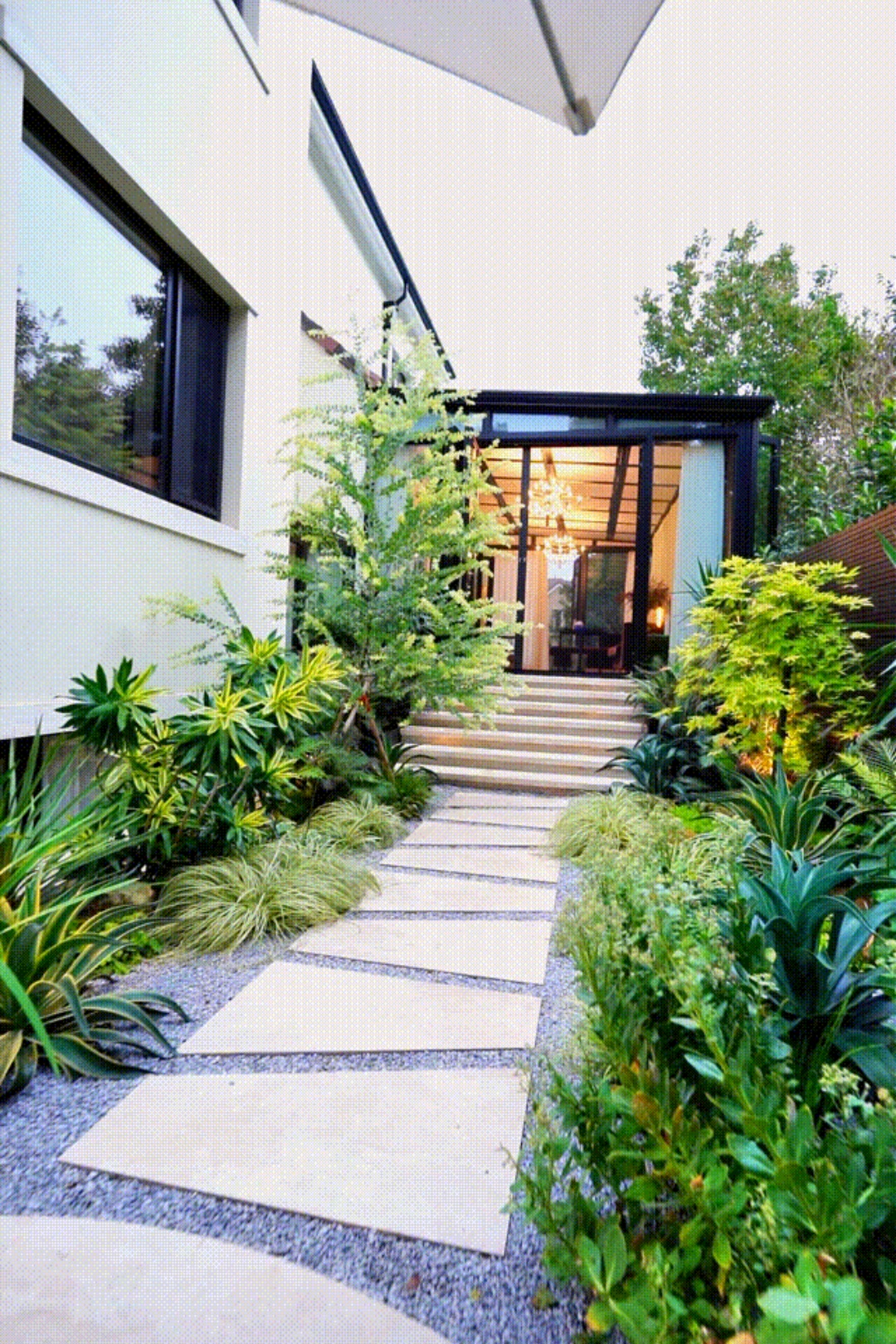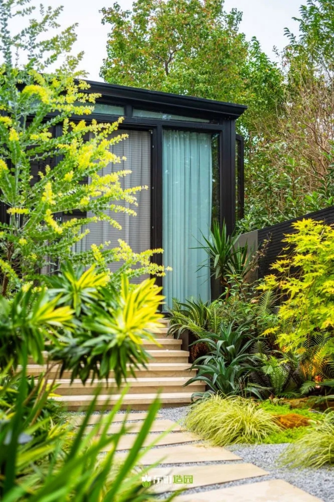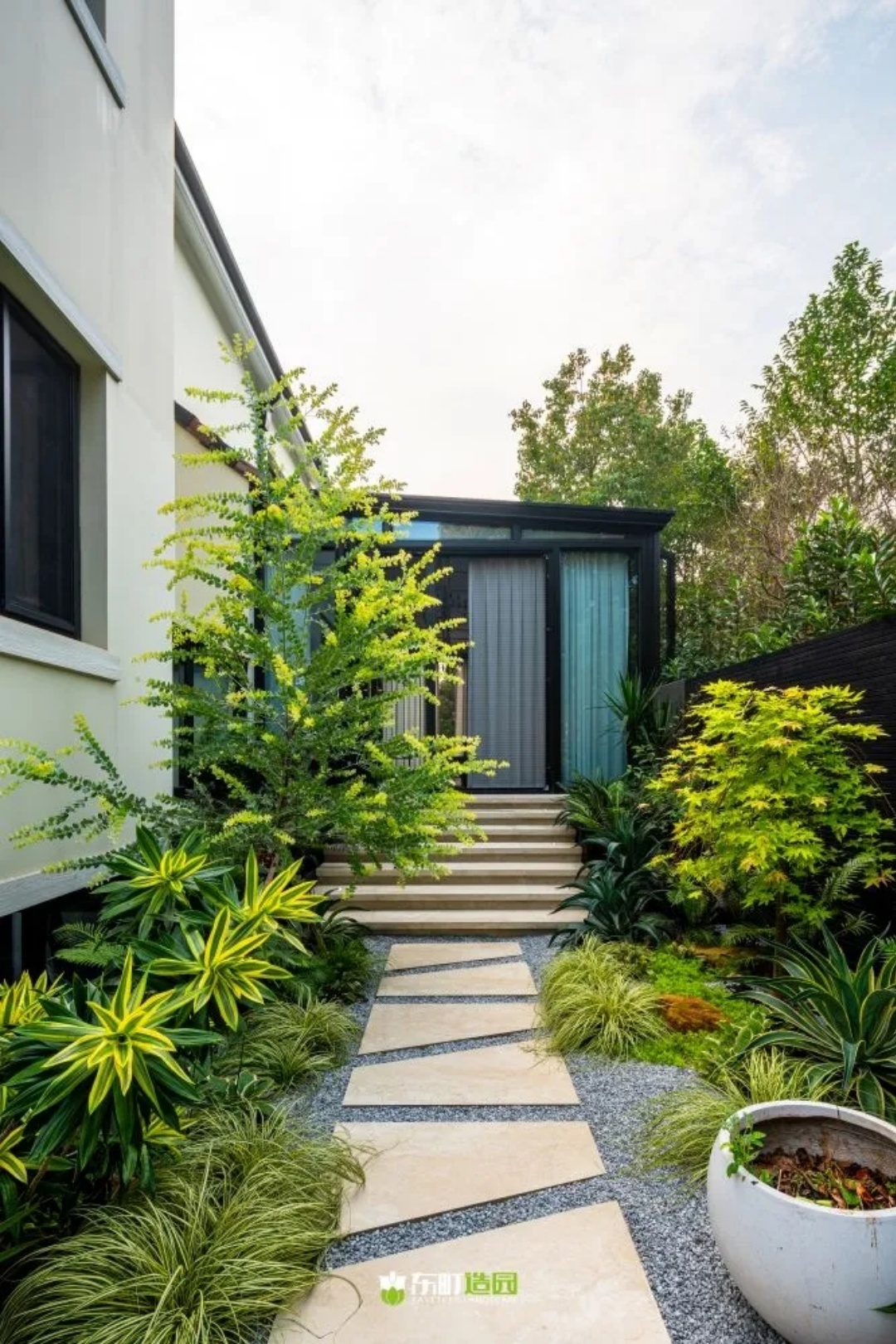 在这个现代庭院里,设计师强调了采光景和汀步设计的重要性,异形的汀步设计不仅能够美化庭院,还能为居住者带来一种现代感。