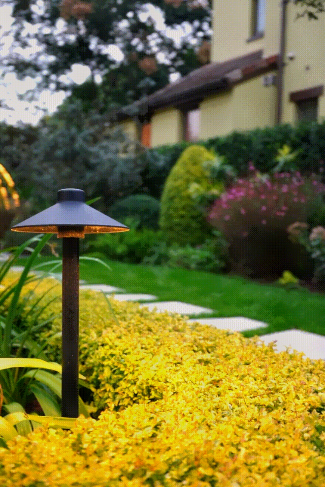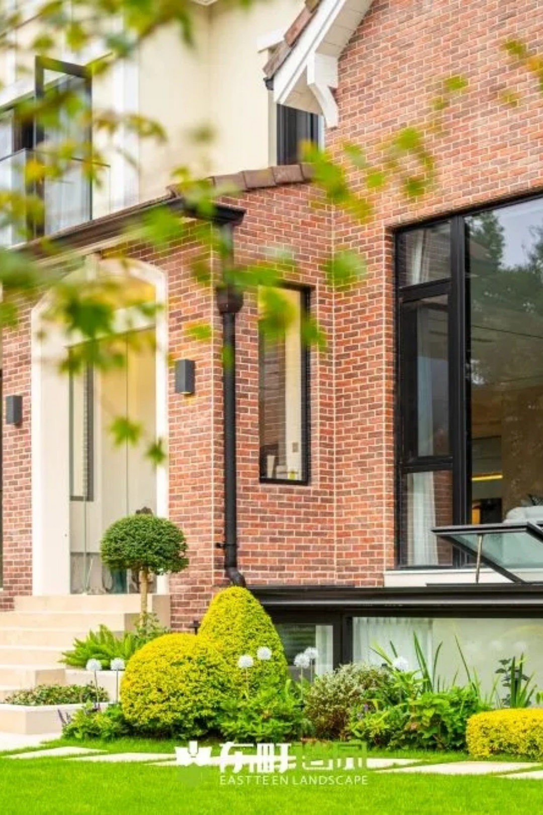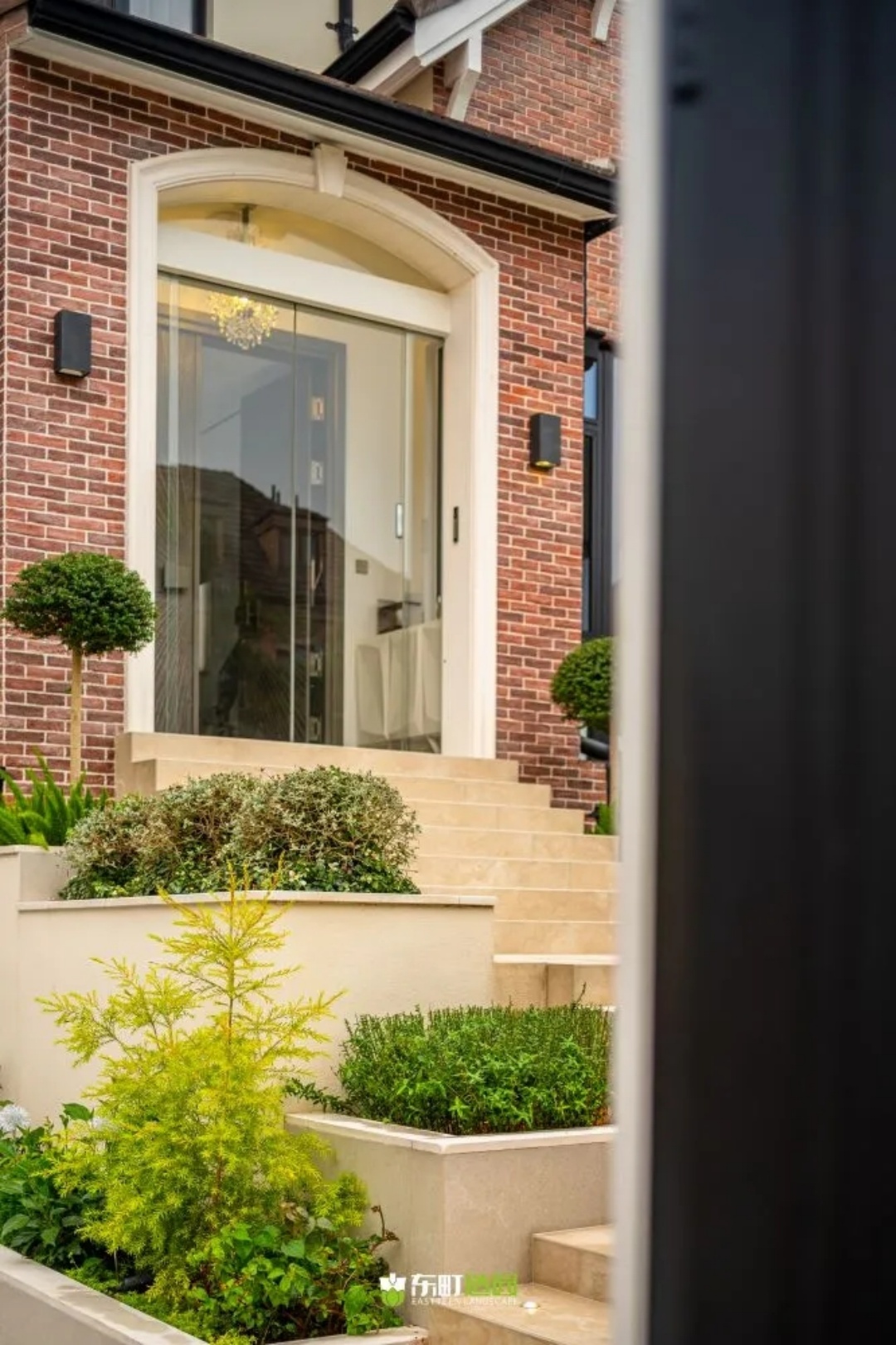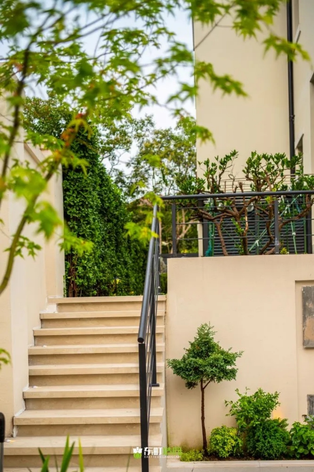 从下沉区域往上走,就能看到一个具有框景和神秘感的小景观,这个地方很有意思。它是业主的私人花园,装饰得非常漂亮。