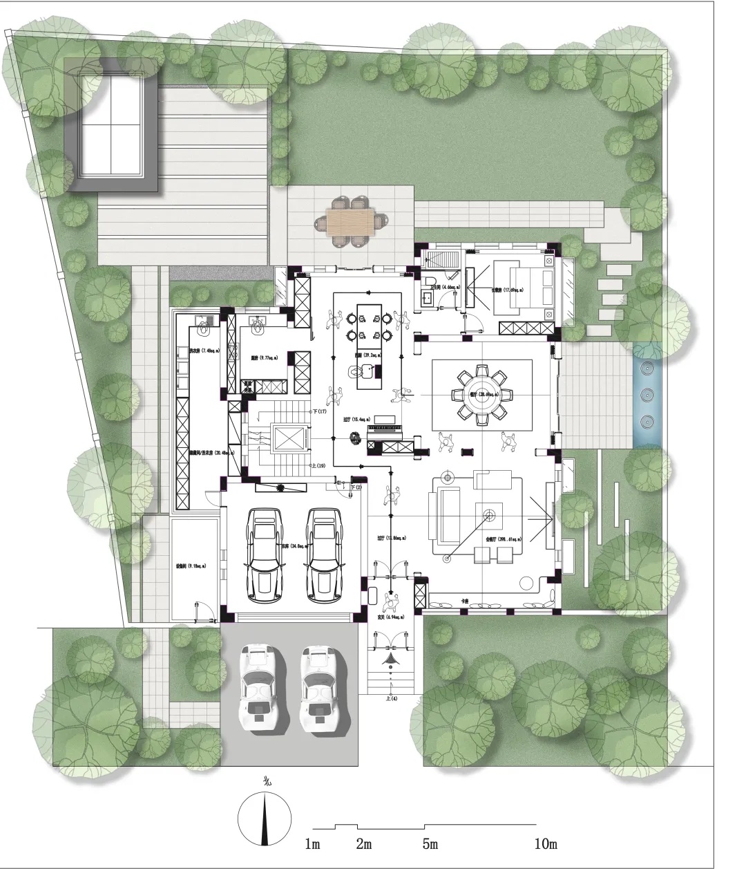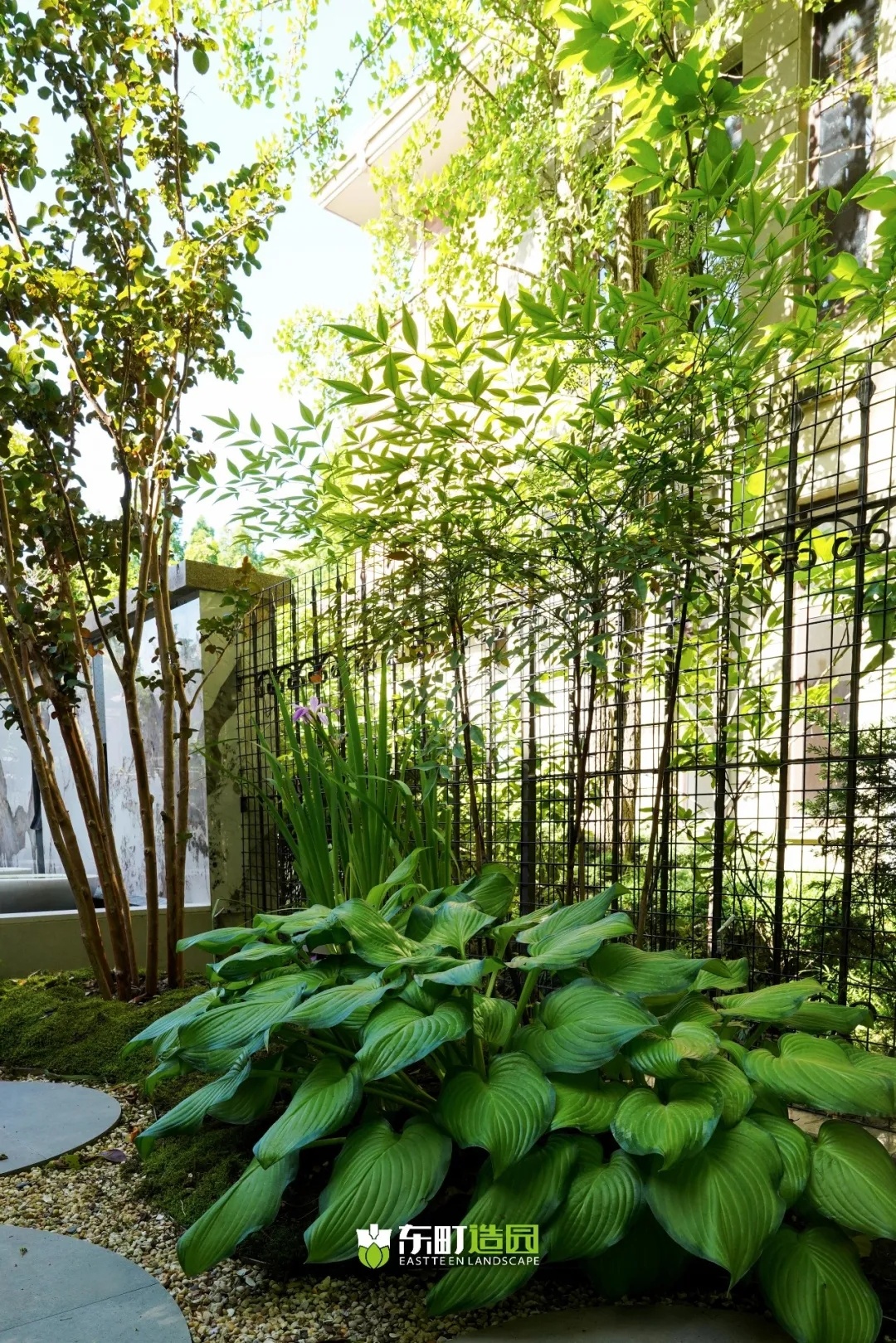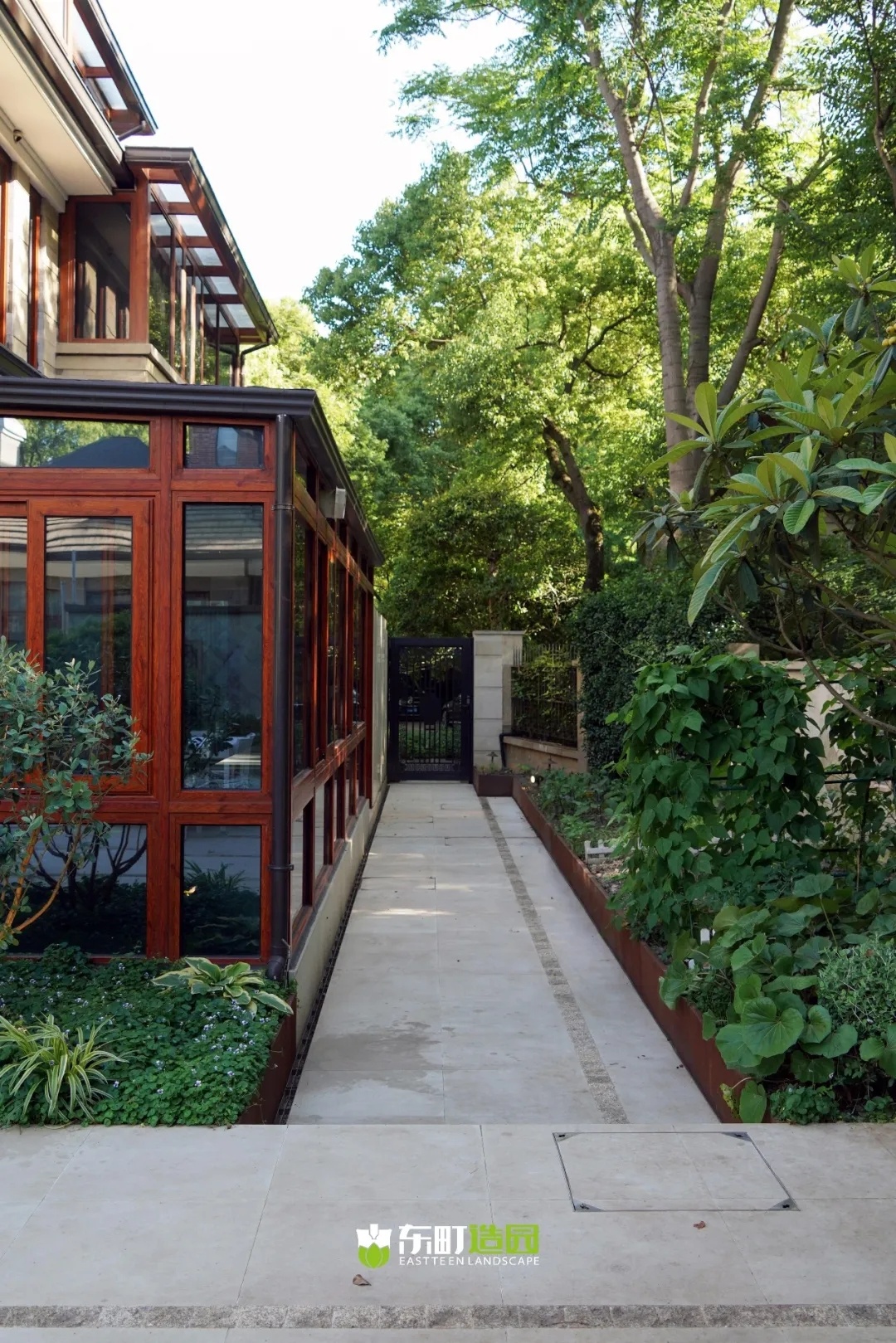 在庭院门的设计上我们遵循和整体小区环境融合,同时来兼顾庭院空间内的风格一致性问题,推开门后我们需要解决进入花园的第一视觉问题,就是面对庭院门有个玻璃采光井,所以我们需要通过造景的方式来进行美化遮挡,同时又不能影响楼下空间的采光问题。