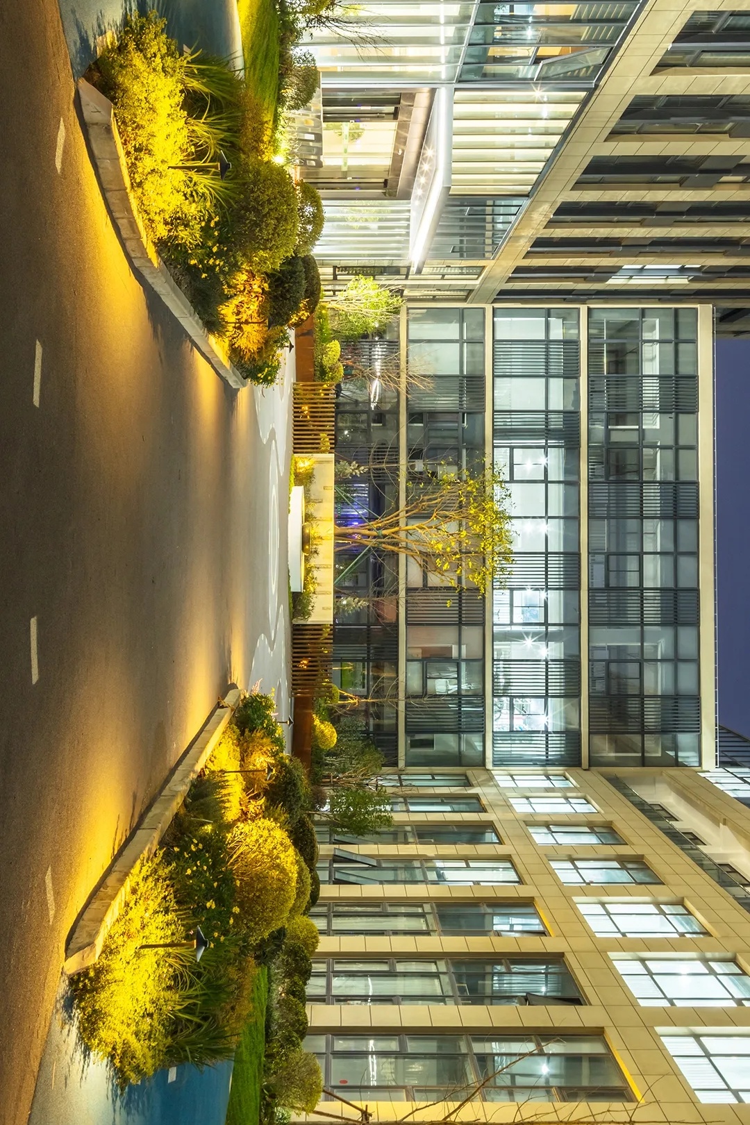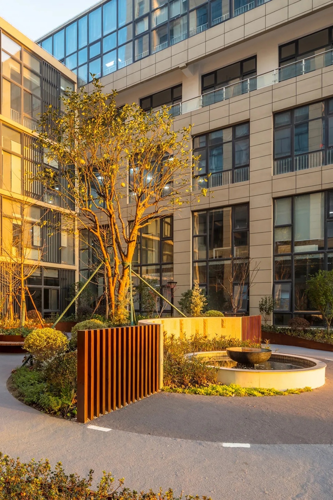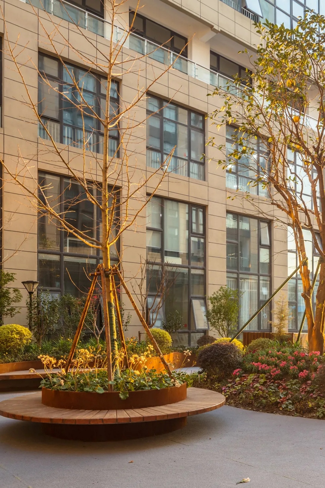 Because there are tall buildings on three sides of the space, this space will feel more depressed. Therefore, the designer planted some upright ginkgo biloba in the space, which has some changes in the season. Moreover, because be in autumn and winter when ginkgo is met deciduous, do not affect the daylighting of indoor space. Therefore, in this space, it mainly plays two roles: First, to weaken the relatively high glass curtain wall. Second, bring some color changes to the space.