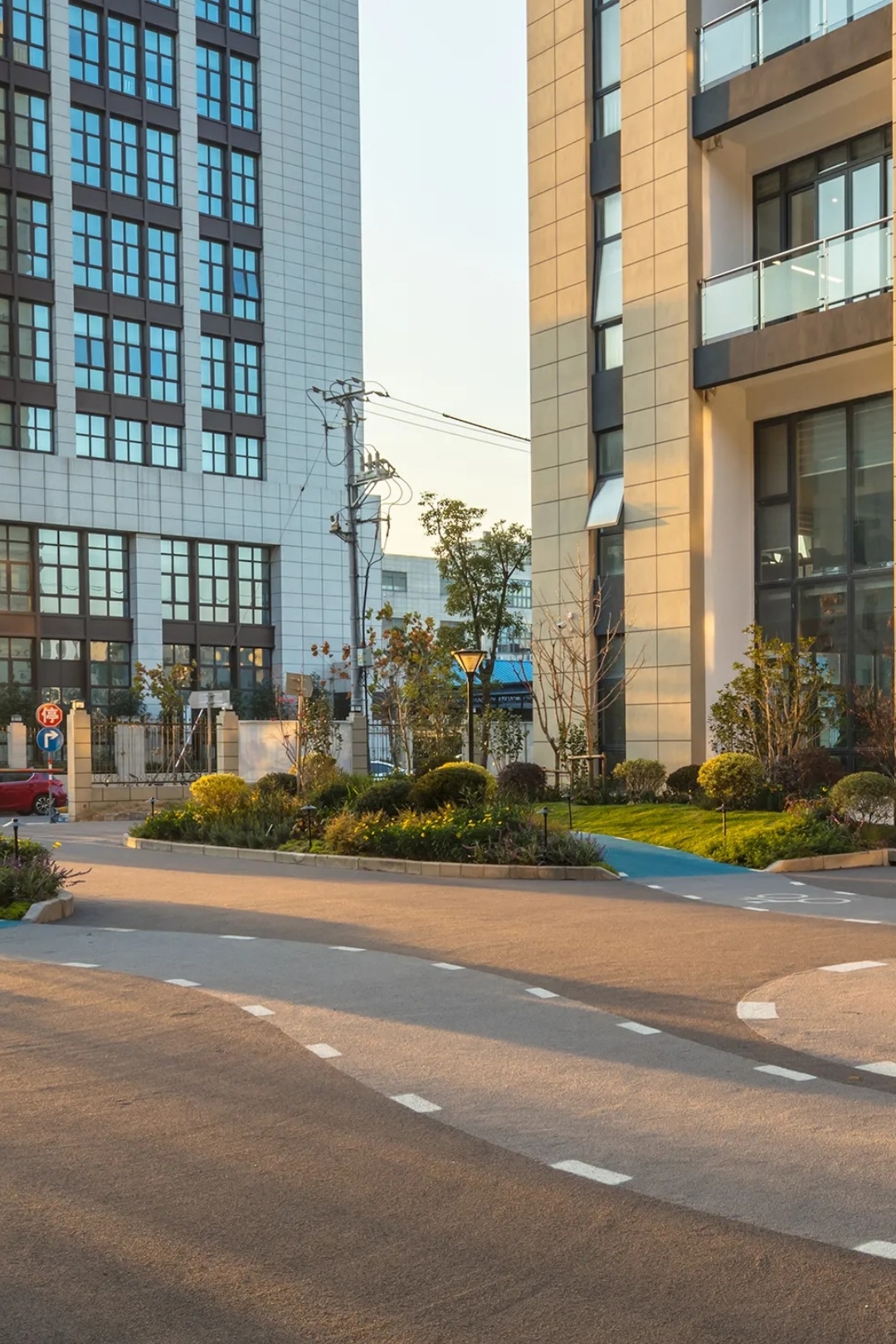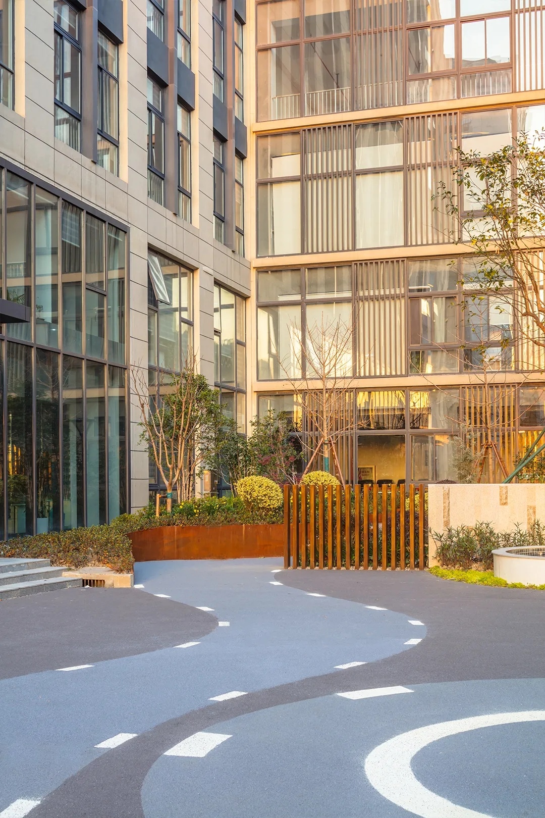 The circular waterscape wall and the low wall grille divide the area into the moving area: the cycling area. Quiet area: leisure seating area.