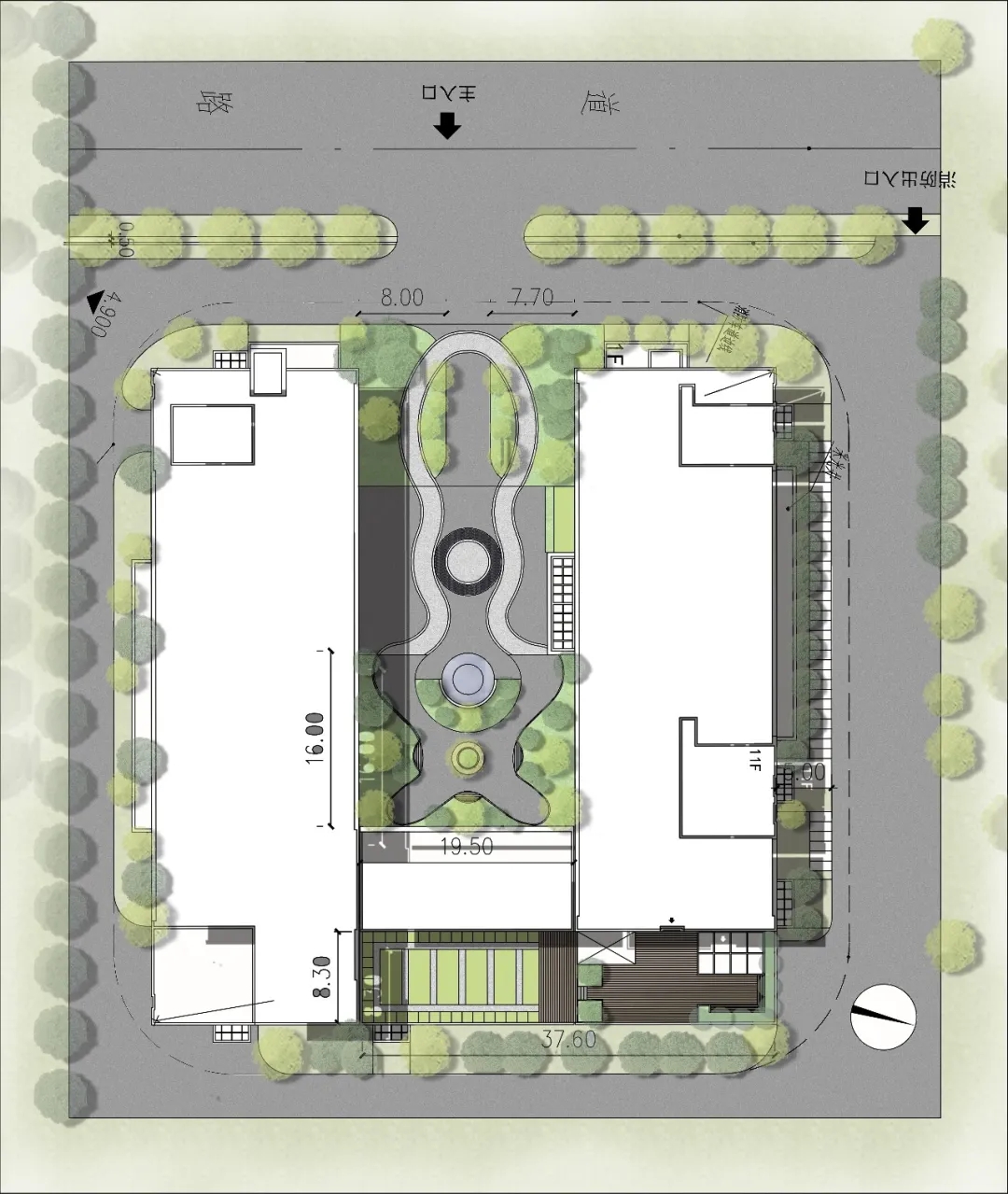 When we were doing a bike-themed mini-park, we thought that they might have engineers doing some experiments on cars in the landscape area, so the designer made a circular, moving line around the landscape. In order to stretch the line a little longer, a kind of circular layout was made.