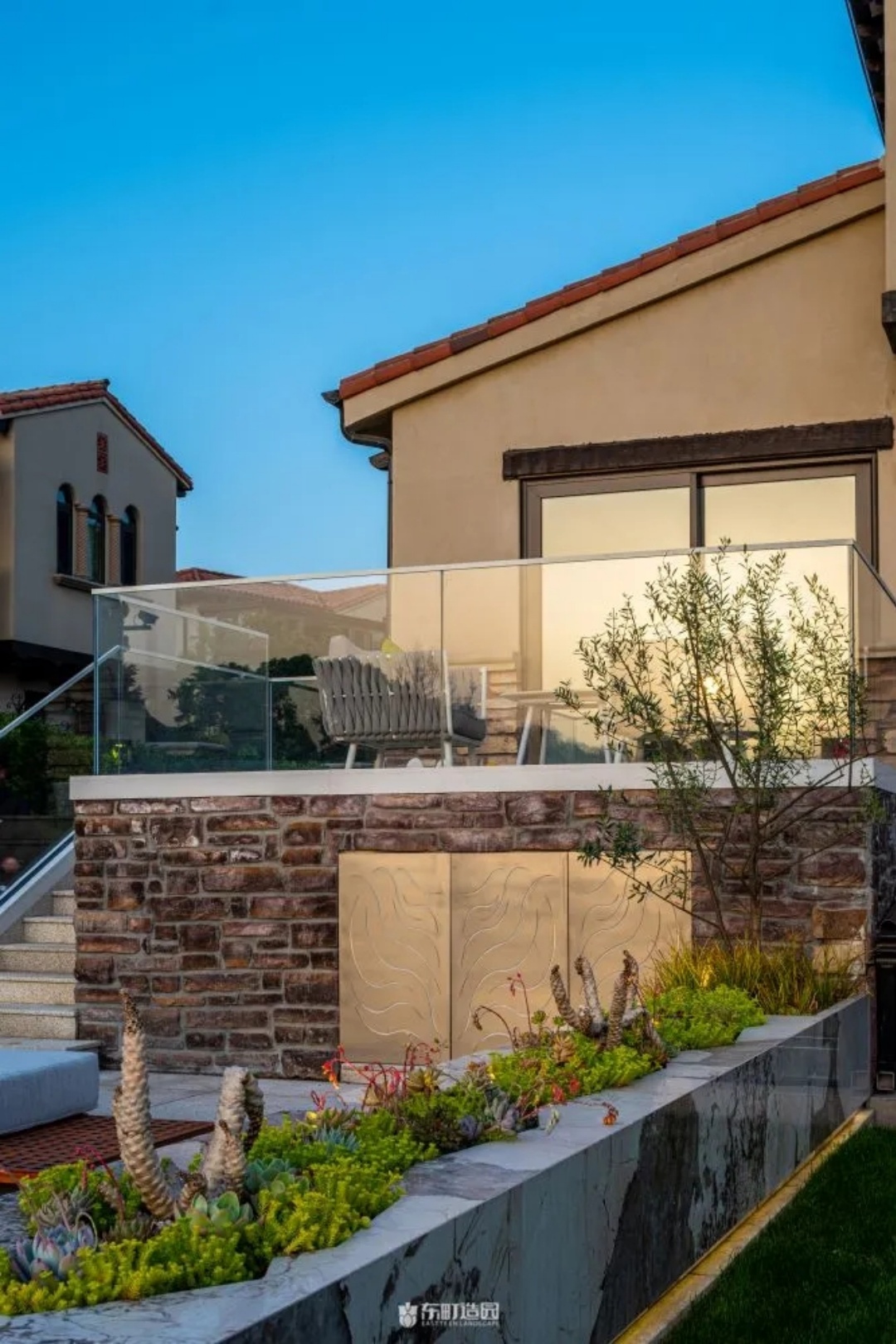 For safety reasons, we used a simple glass surface in place of the railings in the landscape. Where the garden is elevated, we have planted some aquatic plants to enhance the aesthetics of the entire garden.