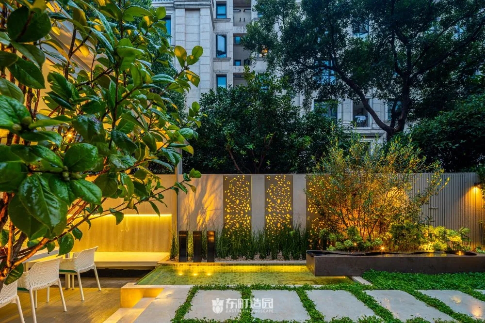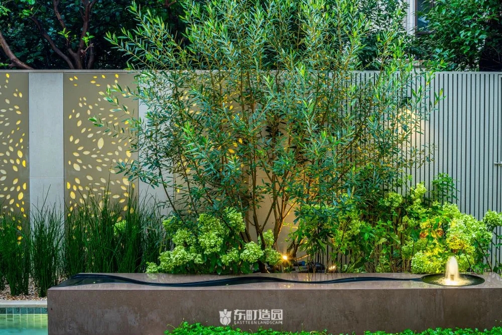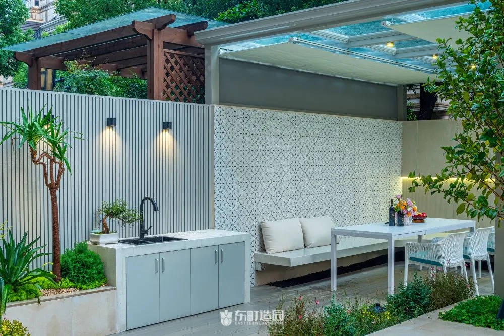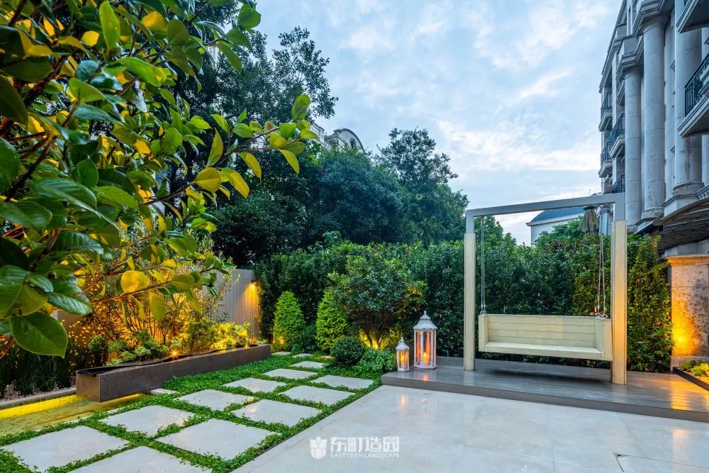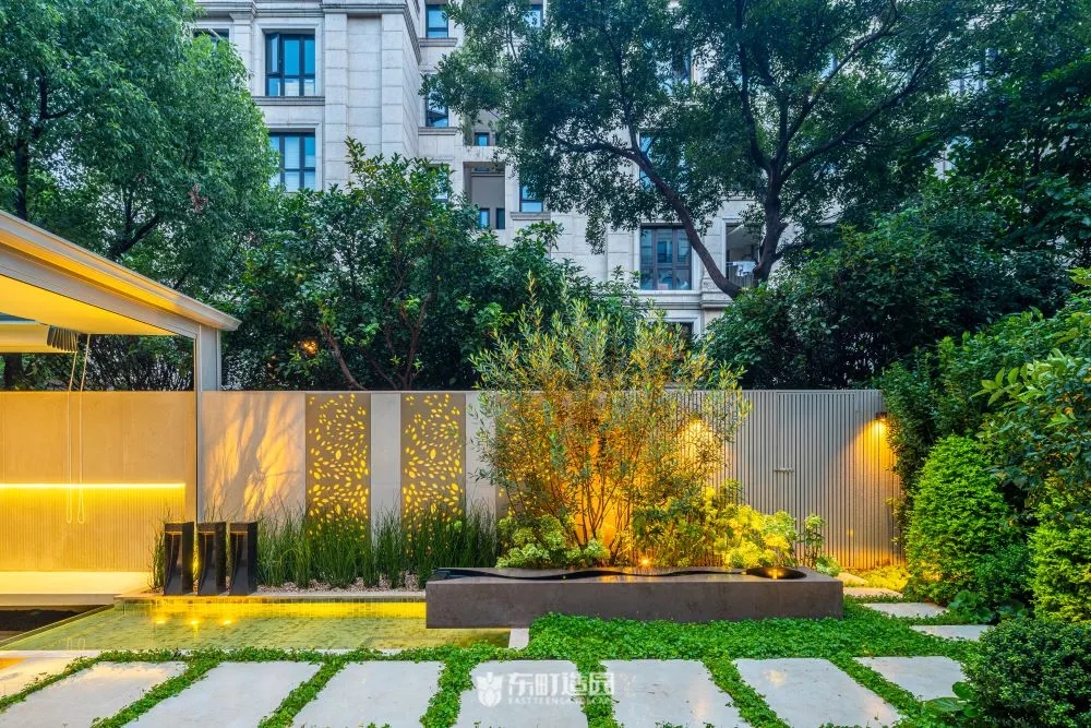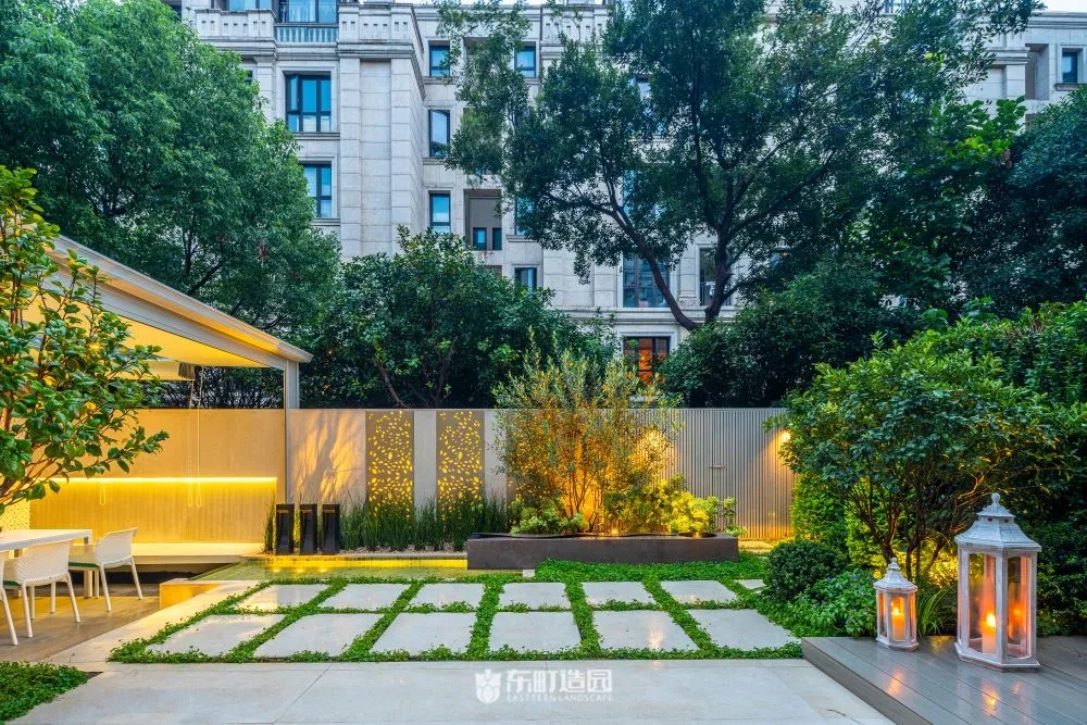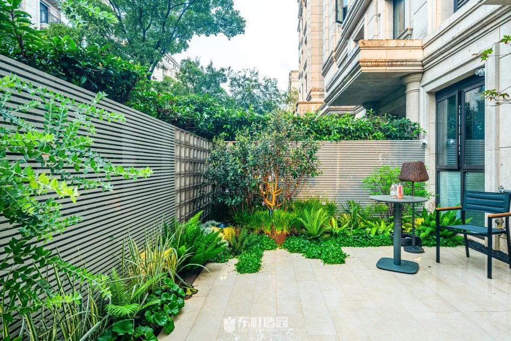 On one side of the garden , for example , we used flowerpots and hedges . Flower tiles add a modern touch to the whole space, while green hedges provide a green backdrop to the garden。We chose boxwood as the hedge plant, because its leaves are dense and delicate, and have good privacy。We wanted the private garden to look greener, so we made a lot of formal changes to the design.