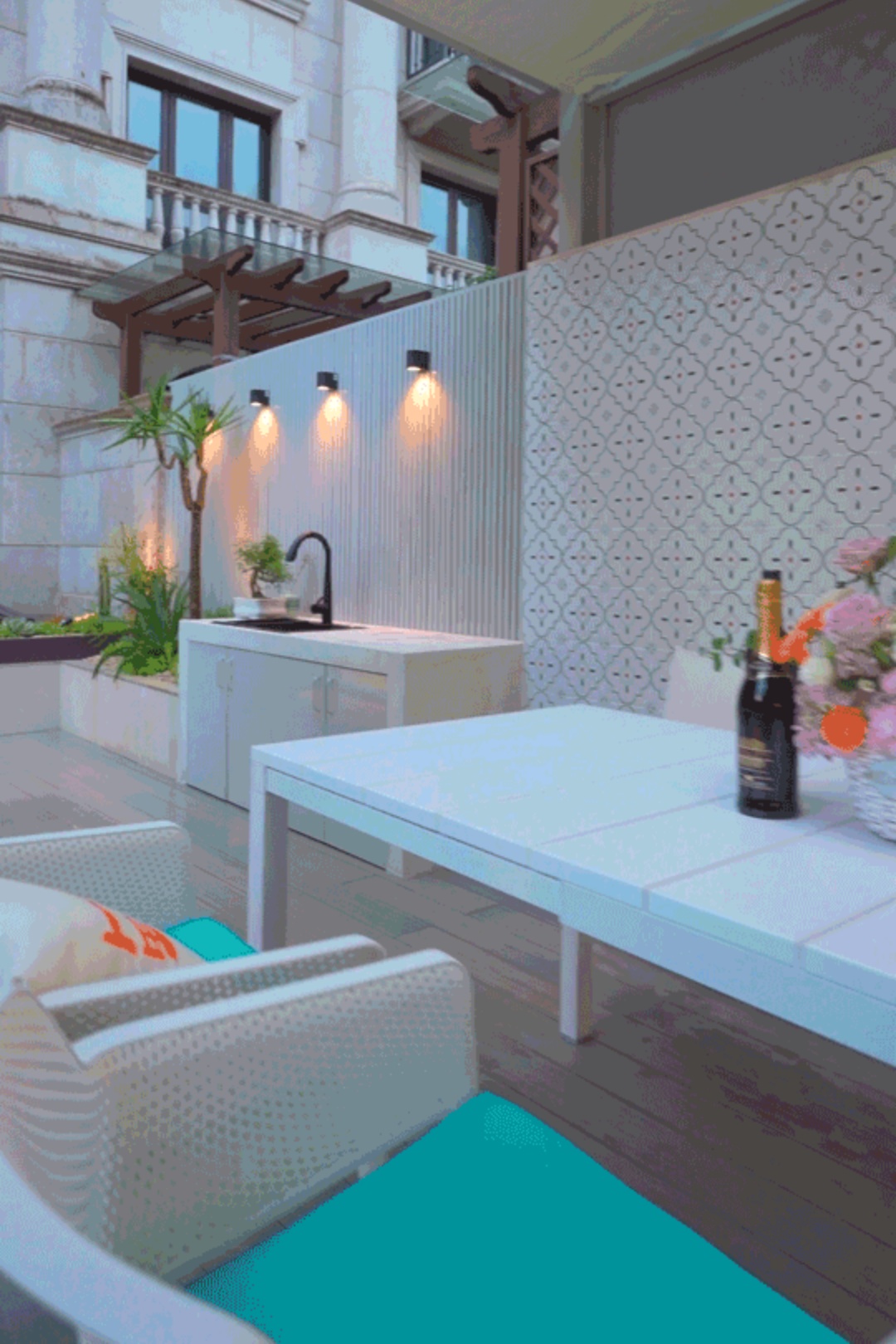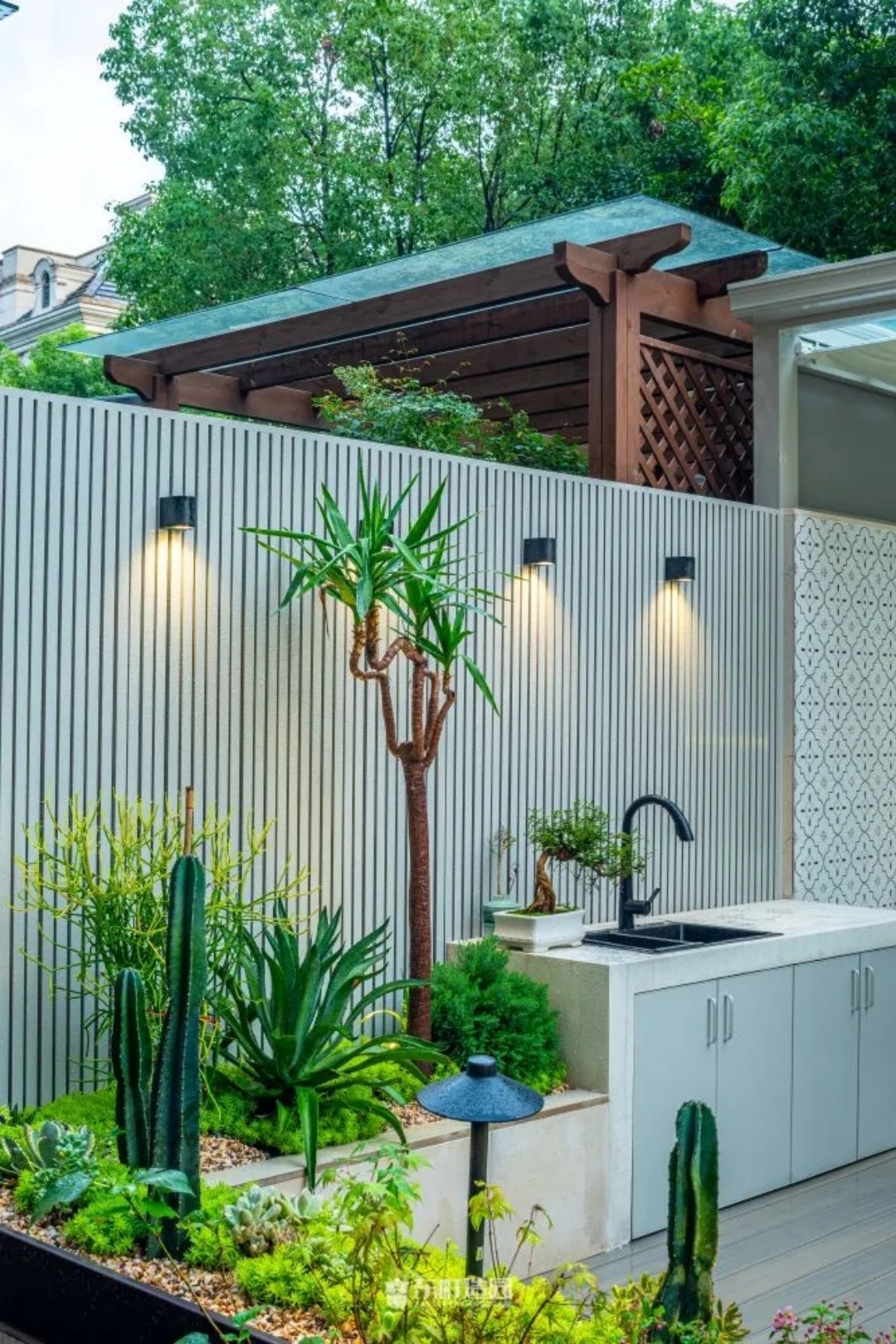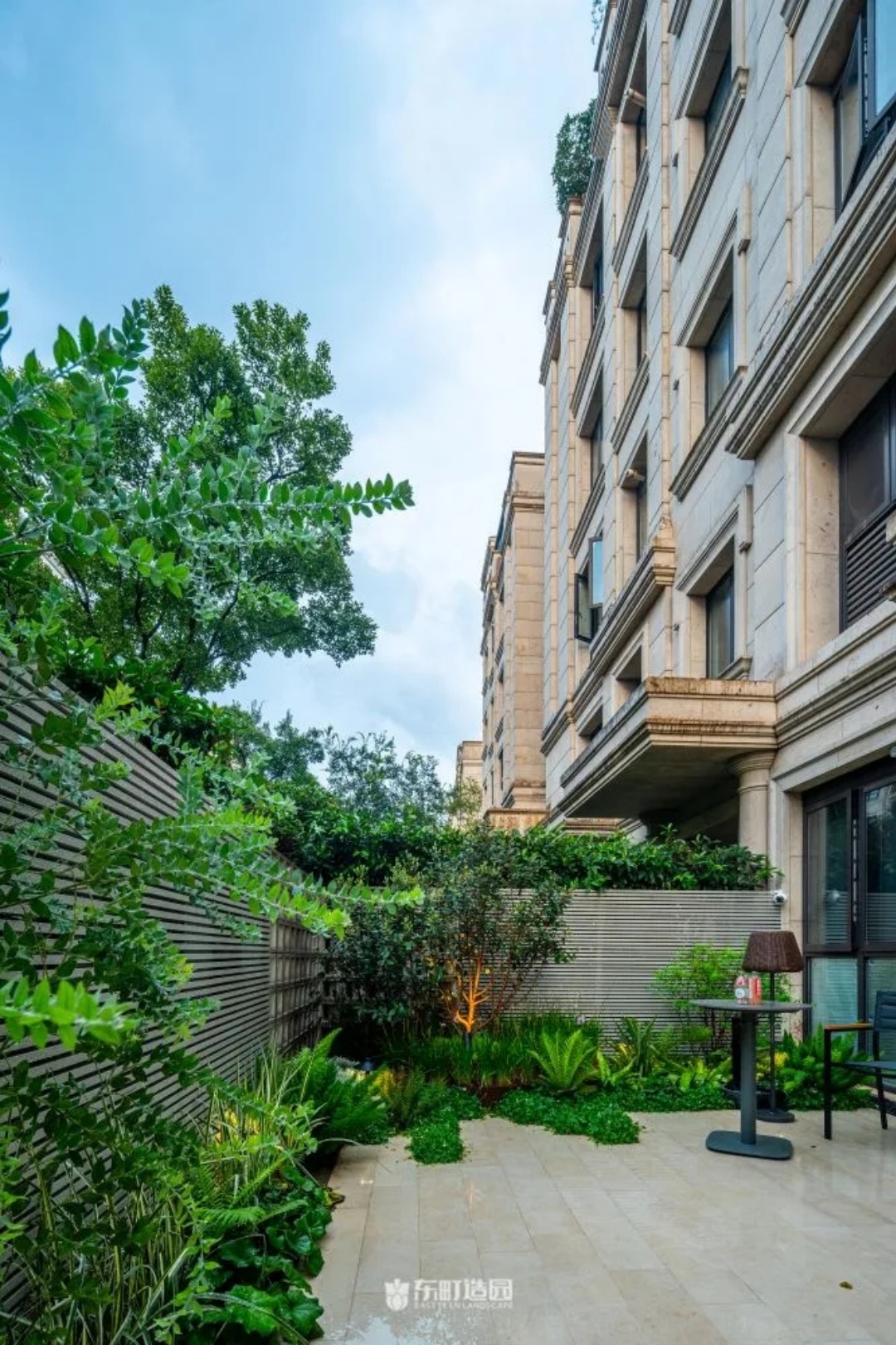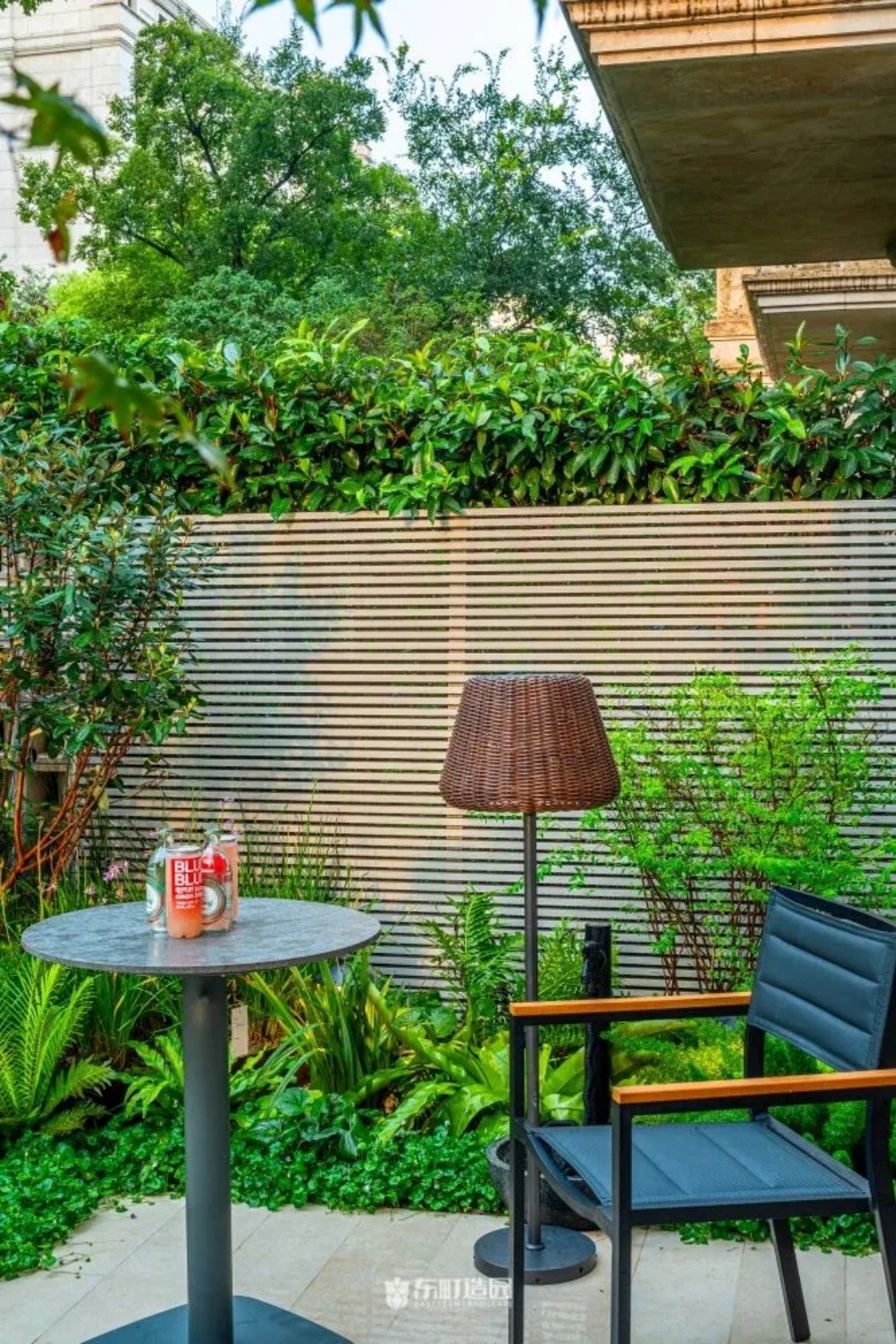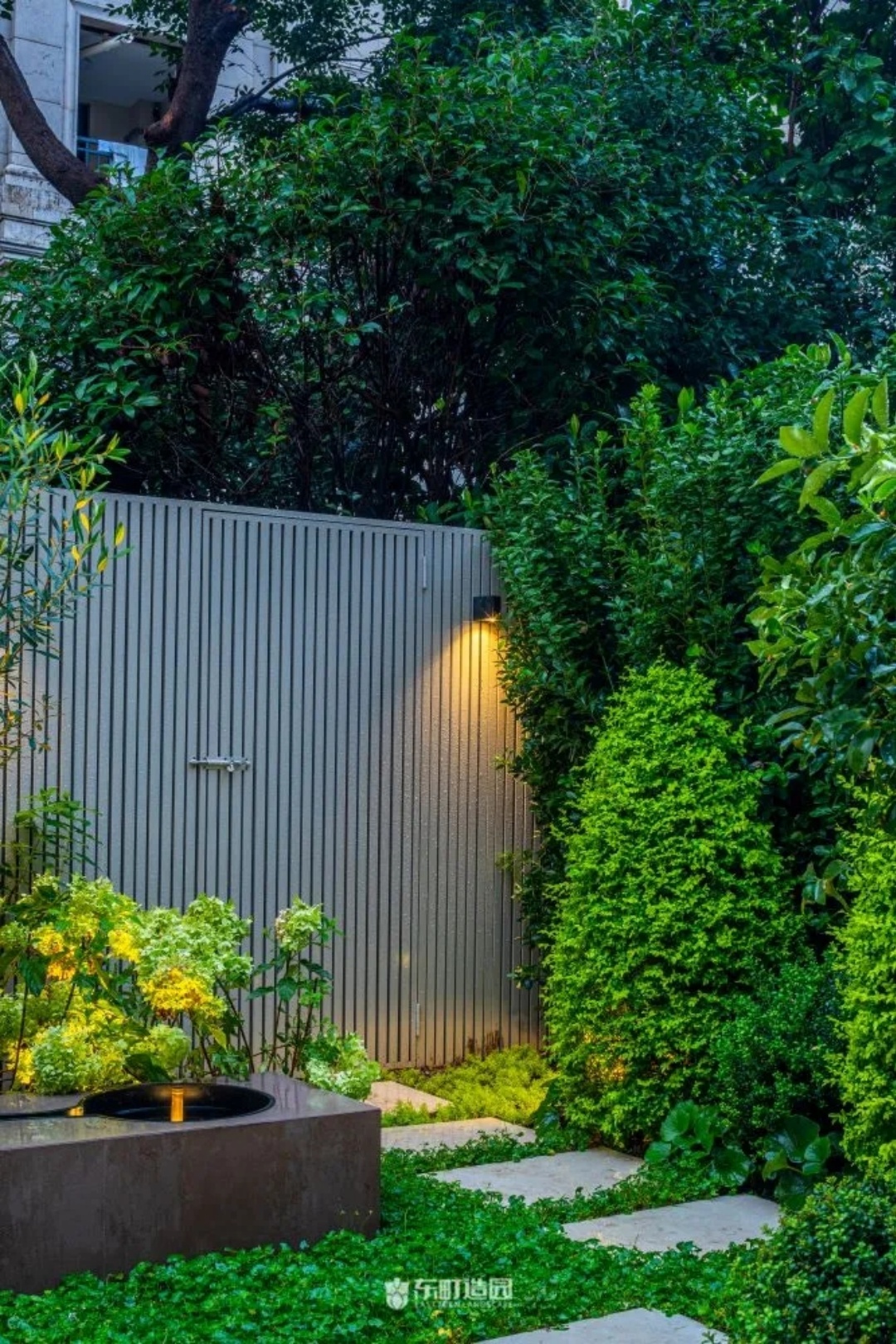 On one side of the garden , for example , we used flowerpots and hedges . Flower tiles add a modern touch to the whole space, while green hedges provide a green backdrop to the garden。We chose boxwood as the hedge plant, because its leaves are dense and delicate, and have good privacy。We wanted the private garden to look greener, so we made a lot of formal changes to the design.