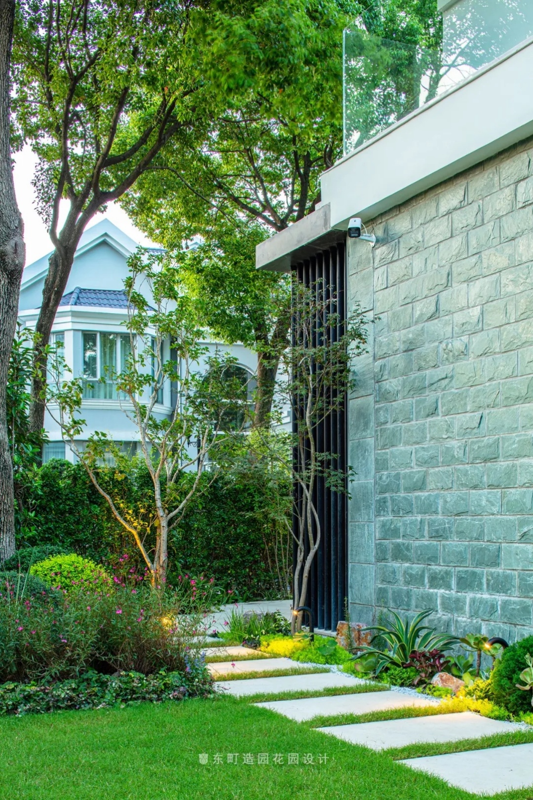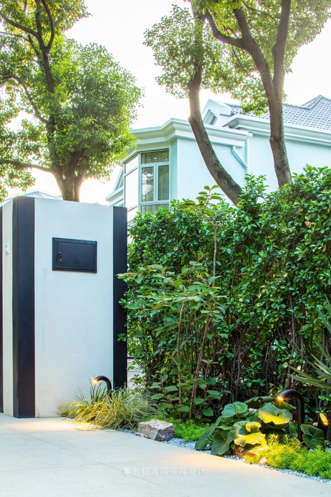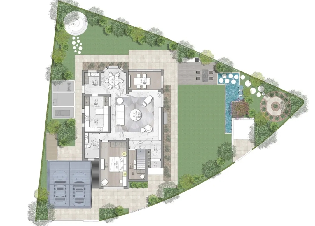 This project is located in Shanghai, the shape of the garden is relatively special, basically leaning towards an equilateral triangle, the building is just in the middle of the triangle, when we look out of the interior space, we will find that the edge line of each garden and the building are not parallel,It will bring a sense of visual imbalance, so to solve this problem, we design some corners of the garden to weaken it, and through the treatment of landscape walls and plant boundaries, the triangular garden is processed into a relatively square garden .