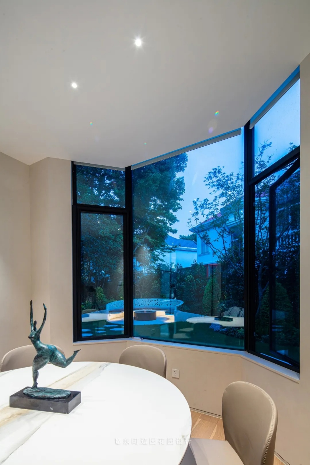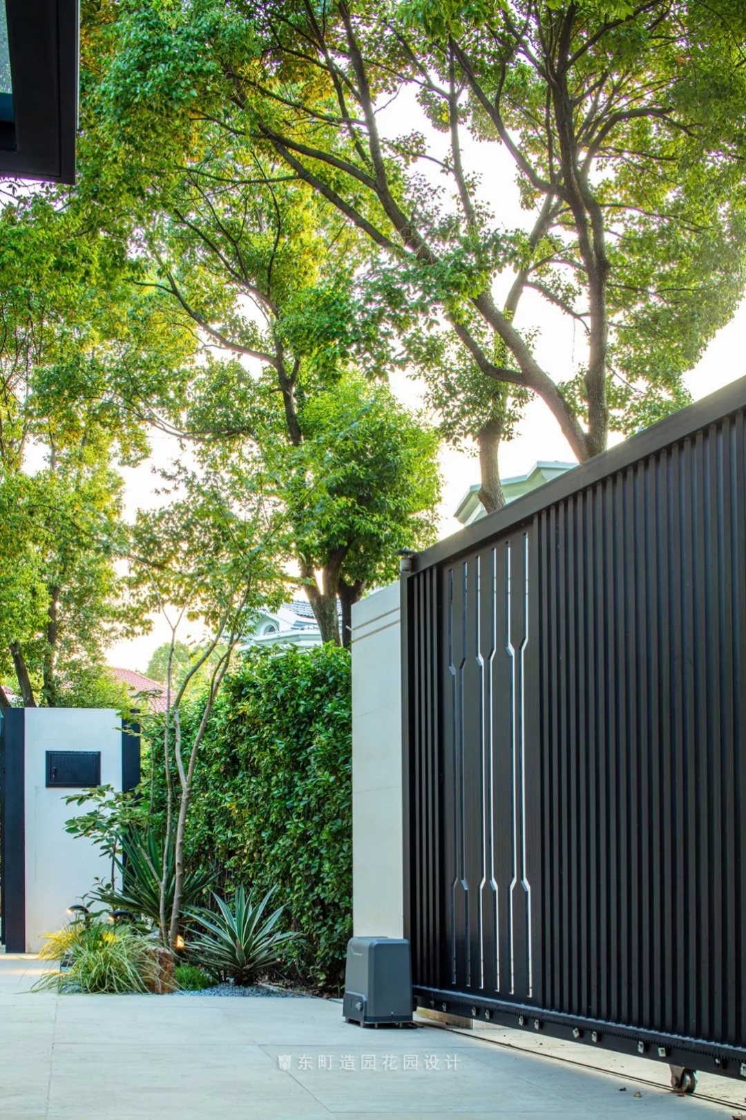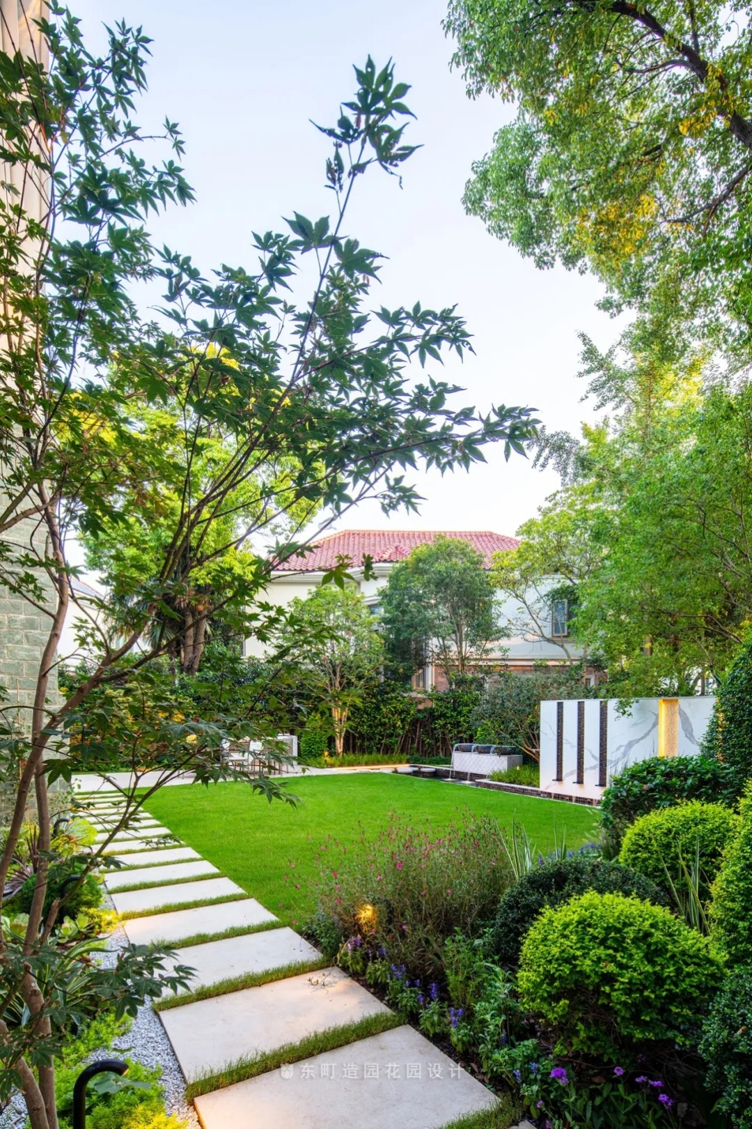 This project is located in Shanghai, the shape of the garden is relatively special, basically leaning towards an equilateral triangle, the building is just in the middle of the triangle, when we look out of the interior space, we will find that the edge line of each garden and the building are not parallel,It will bring a sense of visual imbalance, so to solve this problem, we design some corners of the garden to weaken it, and through the treatment of landscape walls and plant boundaries, the triangular garden is processed into a relatively square garden .