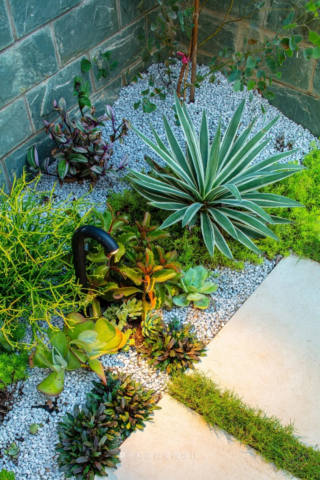 The plant flower border connects different spaces , and the part around the building is made of white gravel with succulents , miscellaneous wood and other easy-to-maintain plants .